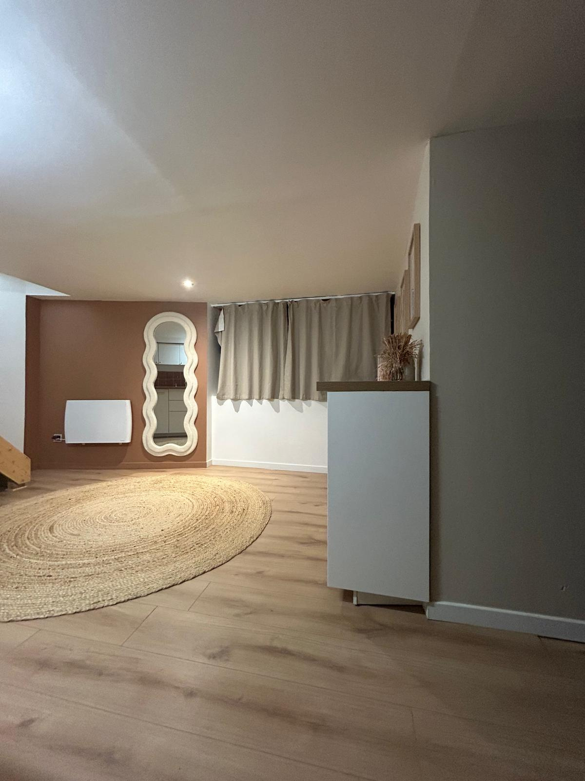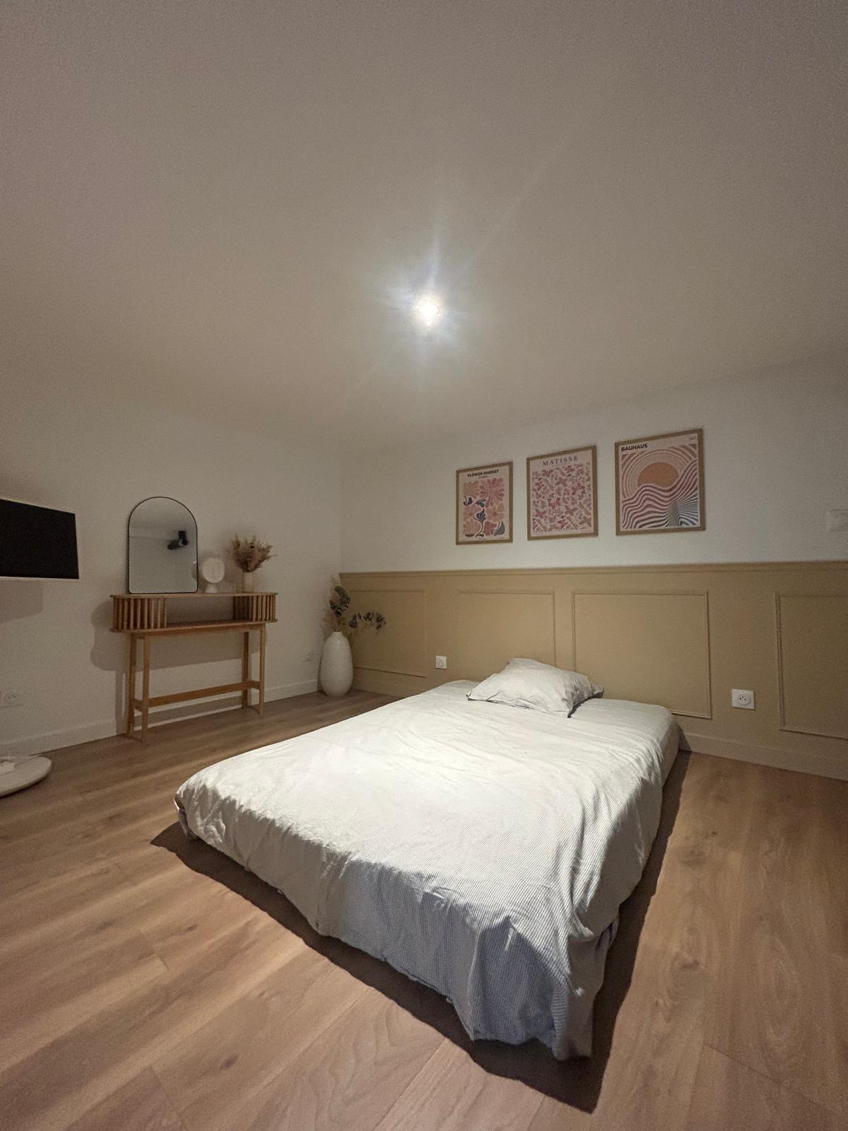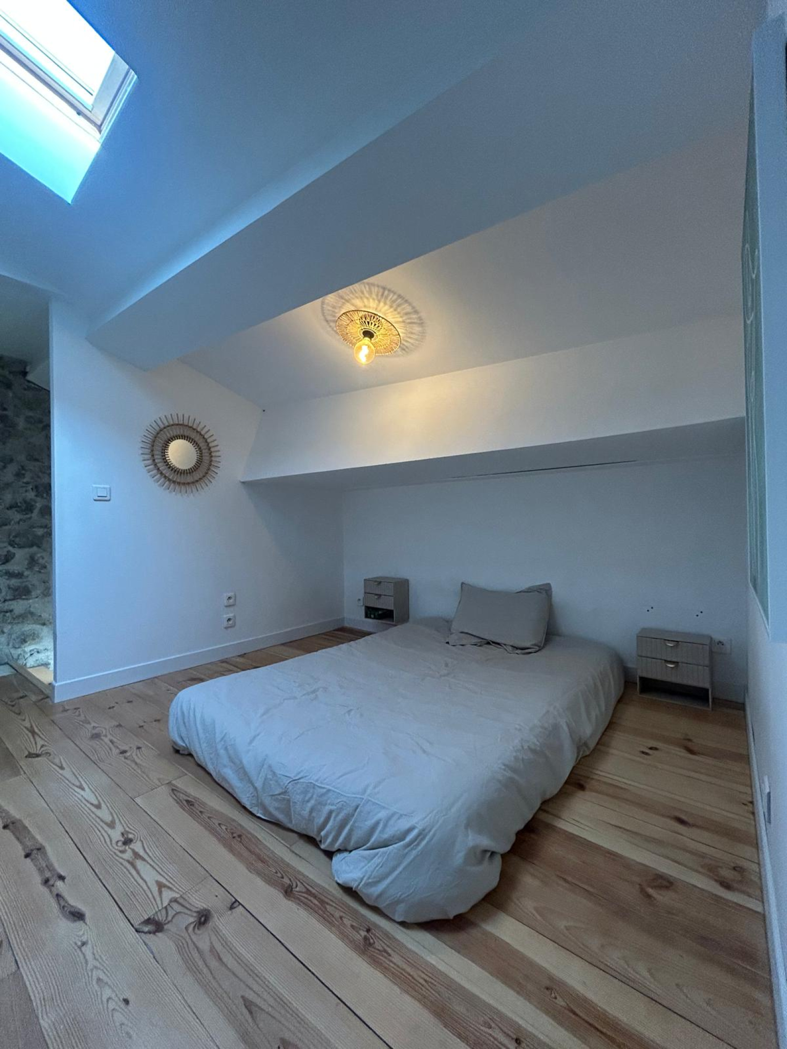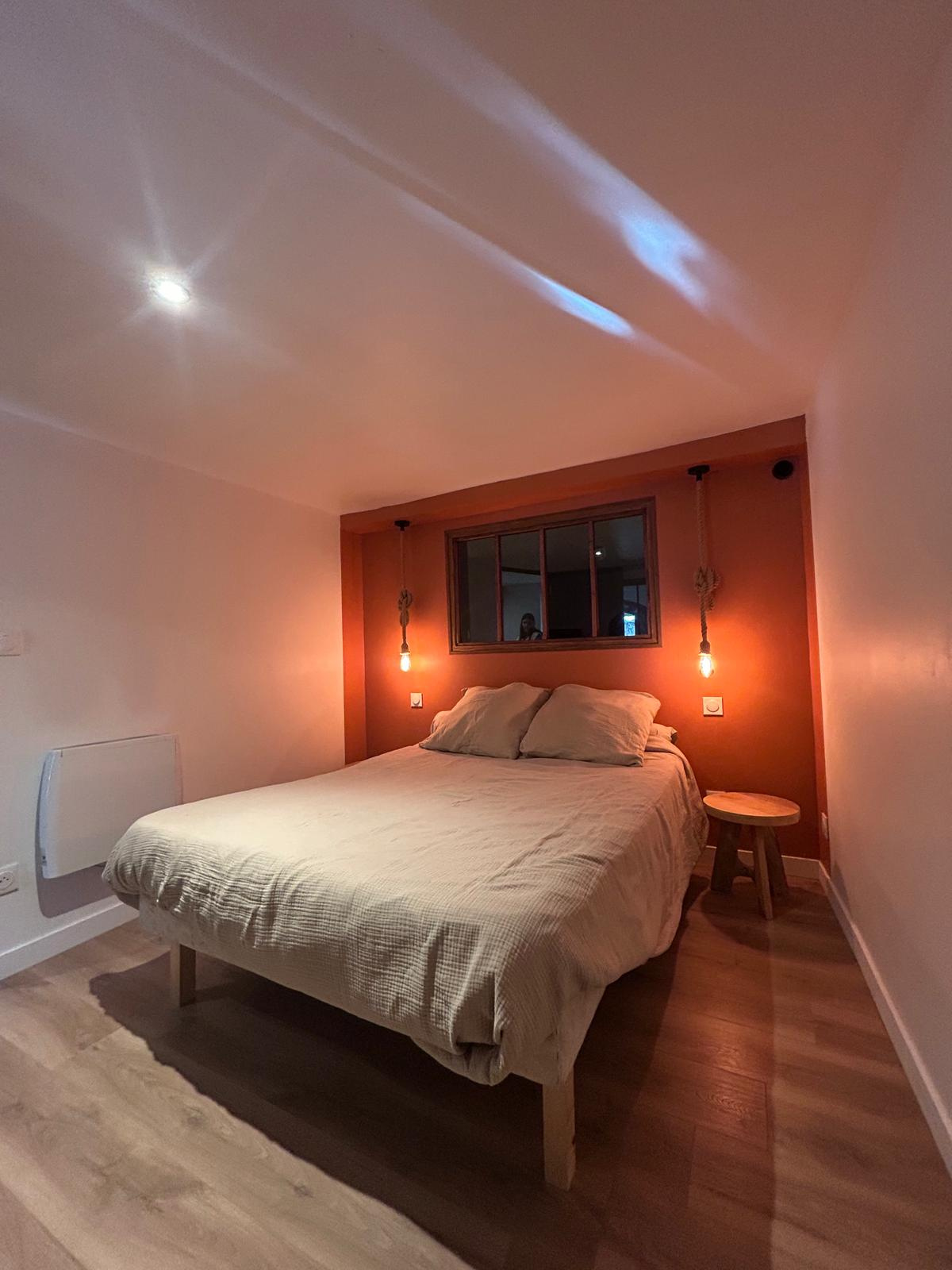 À l’étage, une chambre mansardée avec rangements crée un espace cocooning, intime et chaleureux.